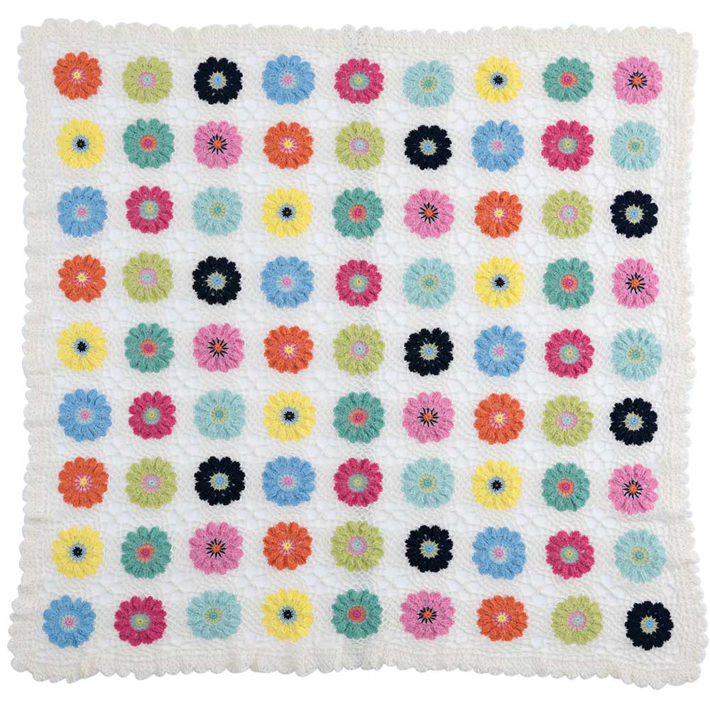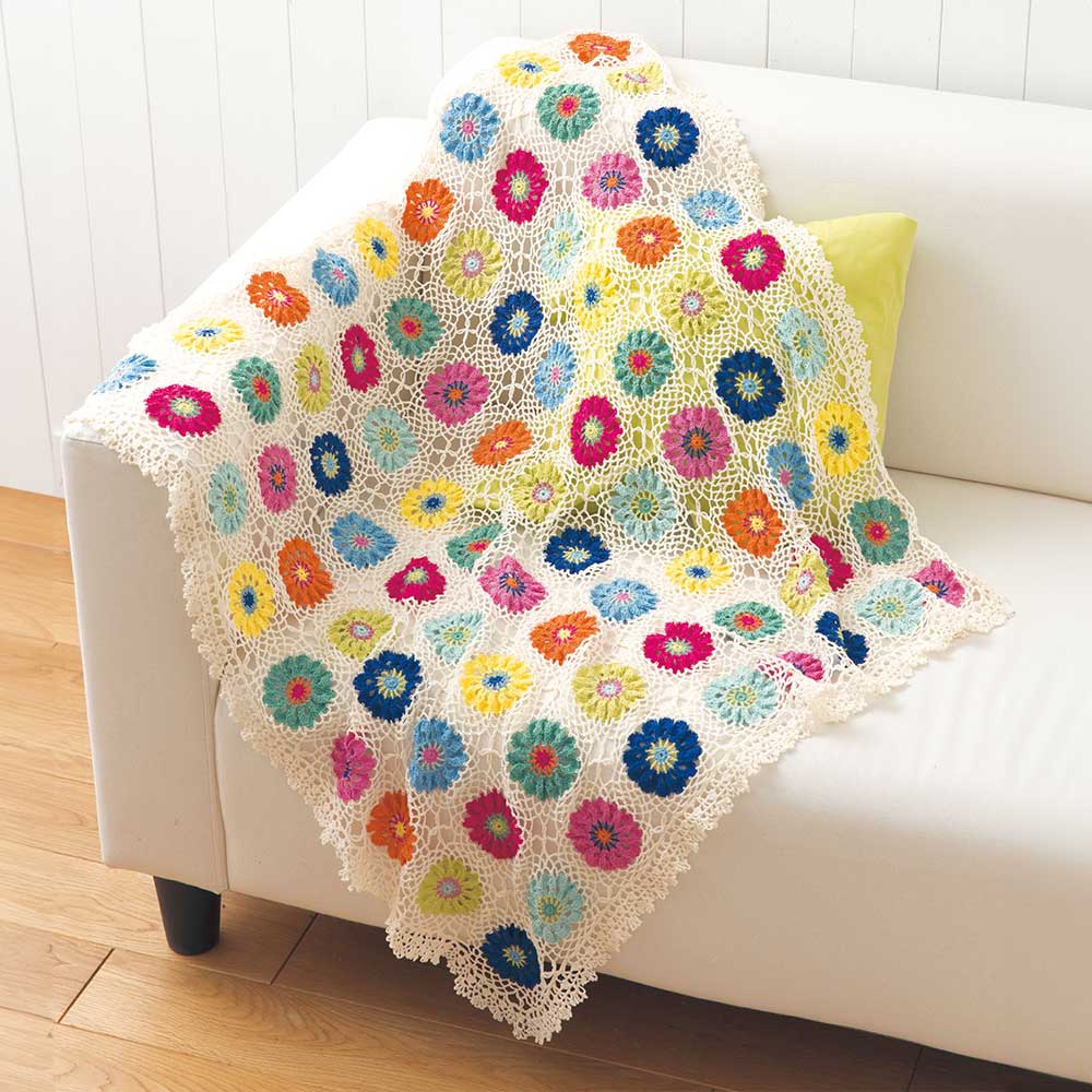 【キット作り方つき】10色もの糸を使って編む、カラフルなブランケット。ソファや椅子に掛けたり、冷房対策に使ったり。アネモネの花をイメージしたモチーフを81枚編み、モチーフの周囲に生成りの糸でネット編みをして、編みつなぎます。初級~中級の方へ。