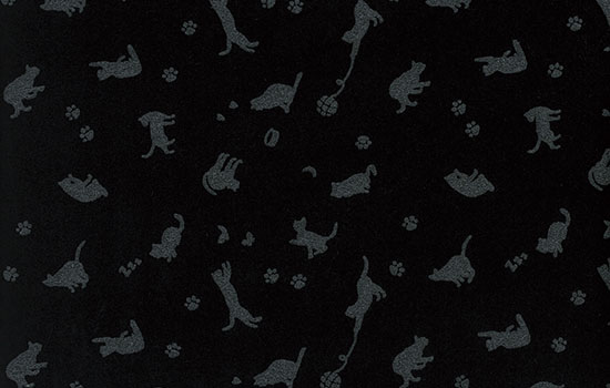なめした鹿革に漆で模様を描く高級品の「印伝」を手軽に使えるベルベット調布で再現。ネコ柄も漆風に盛り上がるように出ています。バッグや小物づくりに。