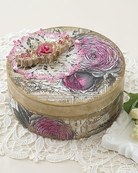イタリア・スタンぺリア社の和紙のような風合いで破れにくい「ライスペーパー」を使った、ペーパークラフト。 フタ部分にドイリーレースや石膏モチーフを飾った円形ボックスです。ゴールドのアクリル絵の具でアンティーク風に仕上げます。