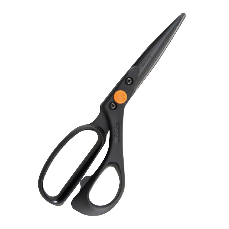 生地をカットしやすいシャープな切れ味が特長の布切りはさみ。持ち運びに便利なキャップ付きです。