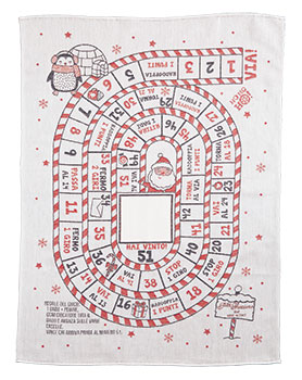 イタリア・グラツィアーノ社製のキッチンクロス。ジャガード織りですごろくモチーフを表現したユニークなデザインです。中央の10.5×11.5cmのアイーダ部分にクロスステッチができます。