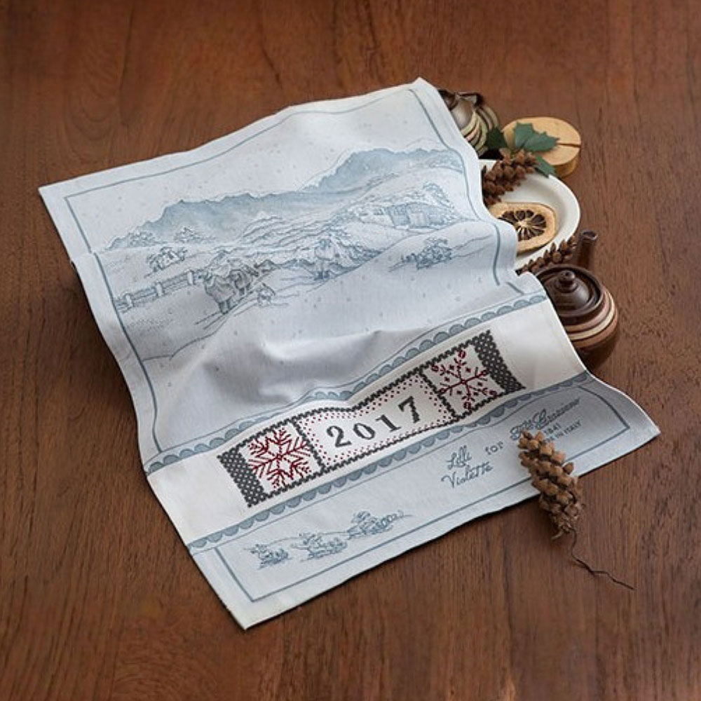 イタリア・グラツィアーノ社製のティータオル。雪遊びをする子供たちをジャガード織りで表現しています。約7.5×31cmのアイーダ部分にクロスステッチできます。