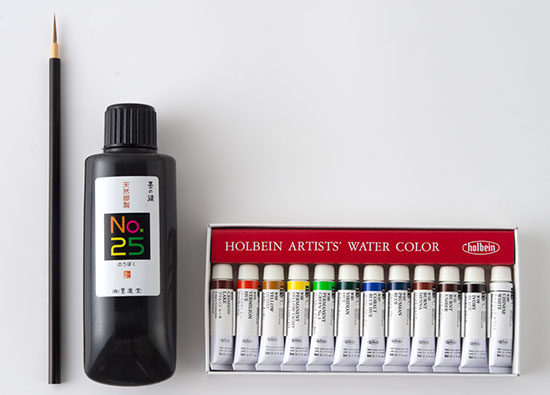 村西恵津さんの『モダン絵てがみ』におすすめの透明水彩絵の具と墨液、筆のセットです。【This item does not ship to overseas.】