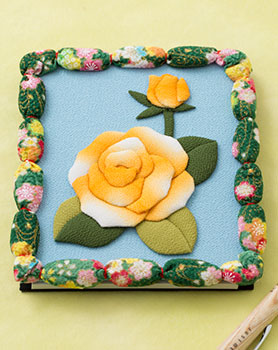 【キット作り方つき】押し絵と簡単な手縫いで作るバラのメモパッドです。黄色い薔薇でカジュアルな雰囲気に仕上げます。。幾重もの花びらが重なったバラは、作ったパーツを台紙に書かれた番号順に貼っていくだけ。手軽に軽に華やかな作品が作れるので、幅広いう年代の方に楽しんでいただけます。プレゼントにもお勧めです。内側のポケットにメモを差し込んで使います。キットにはメモ帳1冊付き。