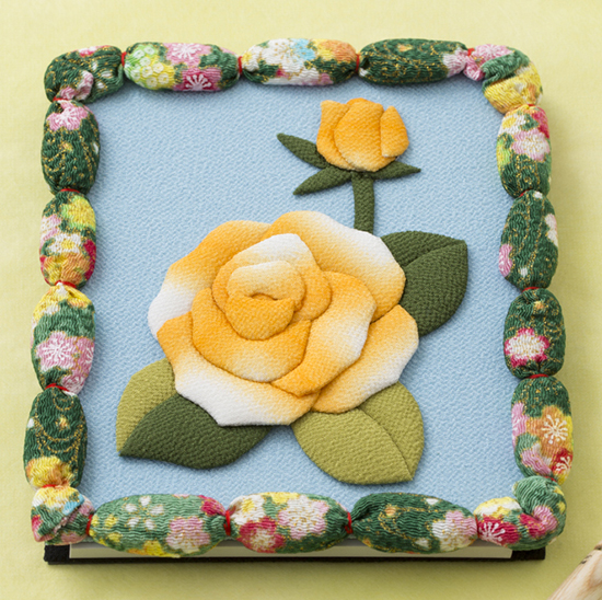 【キット作り方つき】押し絵と簡単な手縫いで作るバラのメモパッドです。黄色い薔薇でカジュアルな雰囲気に仕上げます。。幾重もの花びらが重なったバラは、作ったパーツを台紙に書かれた番号順に貼っていくだけ。手軽に軽に華やかな作品が作れるので、幅広いう年代の方に楽しんでいただけます。プレゼントにもお勧めです。内側のポケットにメモを差し込んで使います。キットにはメモ帳1冊付き。