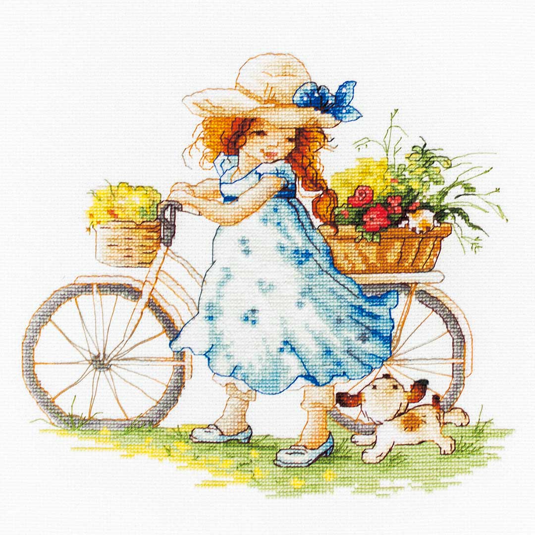 【キット作り方つき】 自転車のかごいっぱいに花をのせた女の子を描いたクロスステッチ作品です。初級の方向き。モルドバ・Luca-S社製。