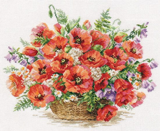 【キット作り方つき】色鮮やかなポピーをいっぱいに盛り込んだバスケットのクロスステッチ作品です。中~上級の方へ。