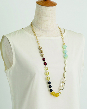 【作り方つき】様々な形や色を組み合わせたビーズを9ピンを使ってつなげるネックレス。軽やかなつけ心地です。9ピンはちょっと難しいイメージですがやってみると簡単です。
