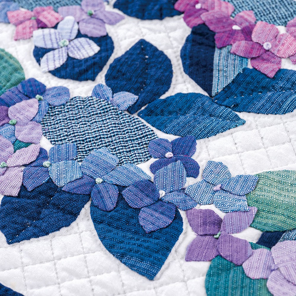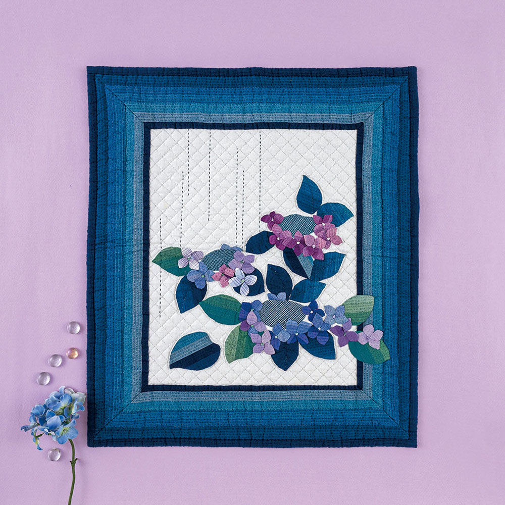 【キット作り方つき】藍色をメインに、紫やピンクも取り合わせてガクアジサイをアップリケ。白無地に雨のステッチを入れた背景も、初夏ならではの風情を添えます。