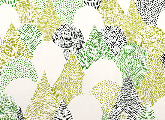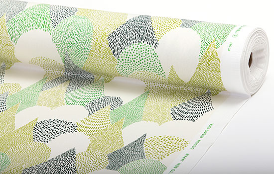 バッグのほか、スカートやパンツなどのウエア類、テーブルクロスなどのインテリア小ものなど、幅広い用途に使えます。やわらかな森の色合いを点描の濃淡で描いた人気のデザインです。通気性よく織りあげたオックス地。お求めやすい10㎝単位での販売です。