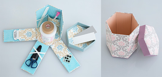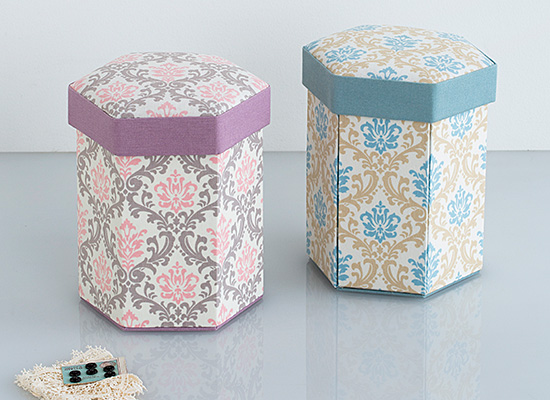 おしゃれな2色使いのダマスク柄。F25013 六角形BOXキットの見本作品に用いています。