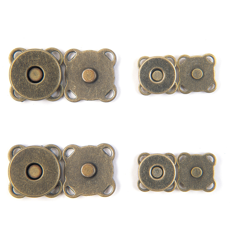でき上がった作品に簡単に取りつけられる、縫いつけ式のマグネット。アンティーク仕上げなので、作品の雰囲気を損ないません。 大・小2個入り。