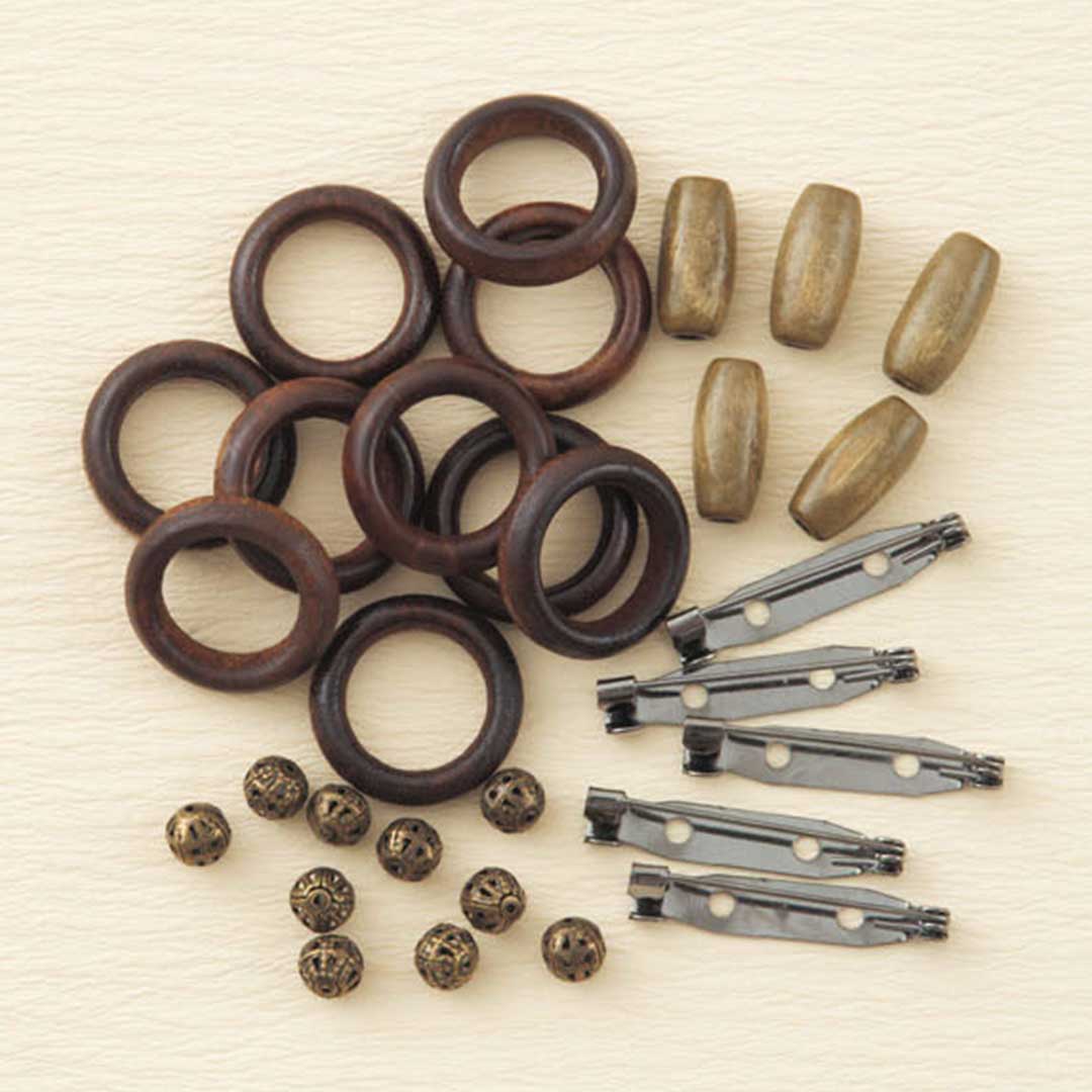 リングパーツ(直径2cm)×10個、金古美パーツ(直径0.5cm)×10個、ウッドビーズ(長さ1.5cm)×5個、ブローチピン×5個