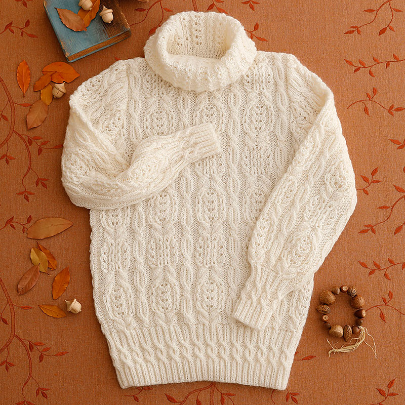 A3サイズ数枚に分けてプリントした全図解の編み図です。必要な部分だけを使うことができます。作品は透かしと交差模様を組み合わせたレーシーアラン風な模様と、ねじり目の交差模様を縦に並べて繰り返す構成です。