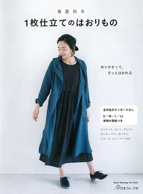 洗練された大人の女性のためのシンプルで飽きのこないデザインをメインに、着やすさ、作りやすさを追求した1枚仕立てのはおりものの作品集です。作品は、リネン、ウール、キルティングのコートやカーディガン、ベスト、ブルゾン、ボレロ、ポンチョ、レインコートなどアイテムもいろいろ。パーツ数は少なく、複雑になりすぎないデザインで、1着で何通りかの着方ができるものや、素材違い、パーツの一部をアレンジして、1つの型紙のバリエーションを増やして春夏秋冬楽しめる1冊に。実物大型紙つき。作家:かたやまゆうこ、加藤容子、Cl’e 酒井奈津子、hane…by deco 吉川秀子。