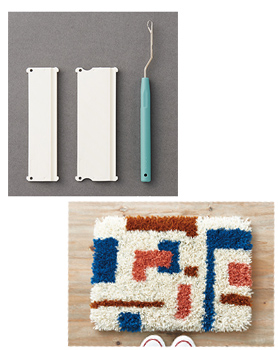 詳しい使い方と、ラグ・タペストリー・クッションカバー・コースターの説明書つきです。毛糸を均等な長さにカットできるヤーンゲージもセットで。