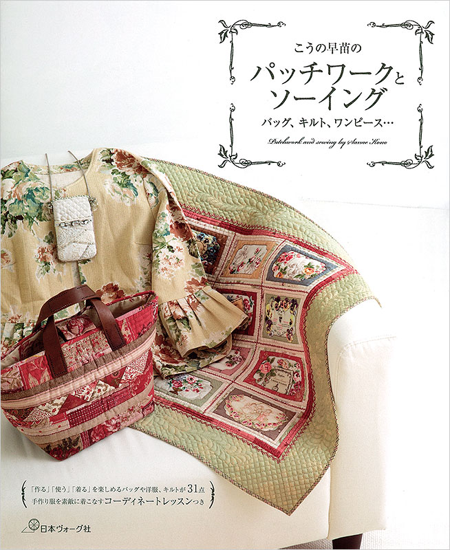 花柄使いに定評のあるこうの早苗さんの著者本。ソーイングとパッチワークの愛好家両方に楽しんでもらえる内容です。パッチワークについては、初心者はもちろん、経験者にも参考になるような、既存の手法にアレンジを加えた新たな楽しみ方を提案します。著者によるイギリスのウェリッシュキルトの取材ページや、手作り服のコーディネートレッスンなど読み物も充実しています。