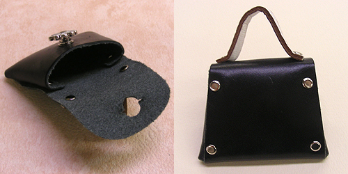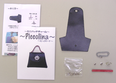 カット済みの革に用具を使って穴をあけ、カシメで止めてミニバッグを作ります。ワンポイントに花飾りのカシメを入れればバッグ型のバッグオーナメントの出来上がり。ピッコリーナとはイタリア語で「小さなかわいいもの」の意味です。