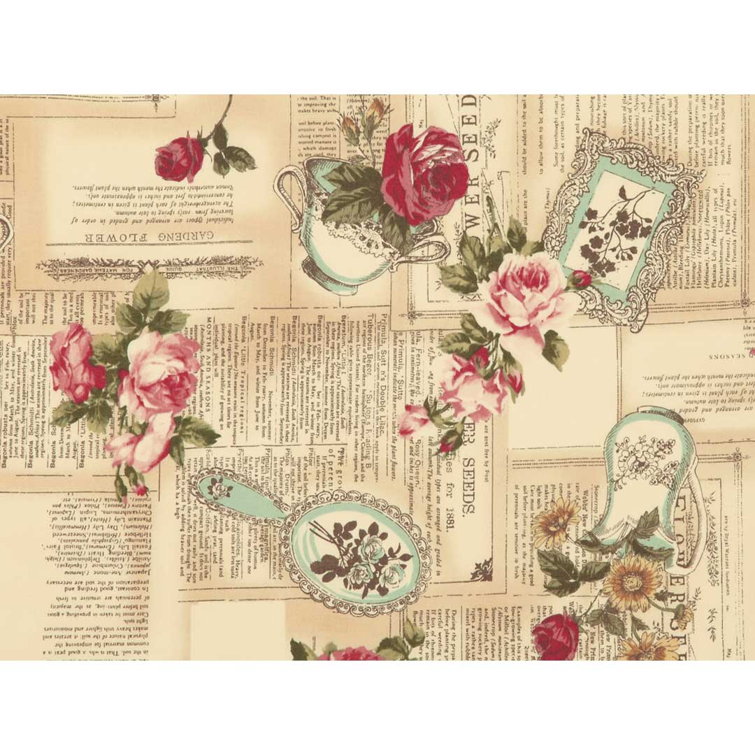英文レターに、バラやヴィクトリア風のモチーフをあしらった大柄布。落ち着いたベージュの濃淡にピンクとブルーが映えます。