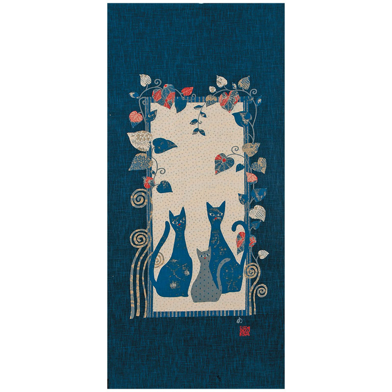 かすれたような藍色の地に、おすまし顔のネコファミリーとツタのフレームをプリント。端を始末するだけで作品になります。