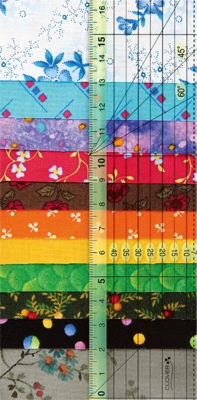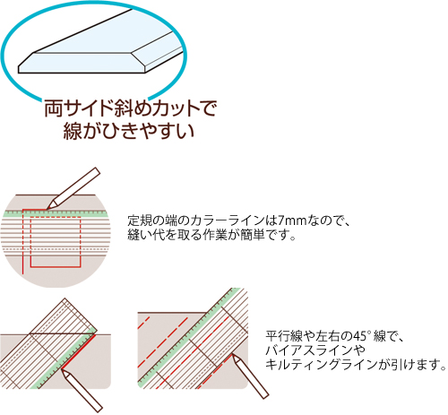 濃色や淡色、柄ものの生地でも目盛りが見やすい、淡い黄緑色のカラーラインが入ったパッチワーク定規。定規の端のカラーラインは7mmなので、縫い代をとる作業が簡単です。平行線や左右の45°線で、バイアスラインやキルティングラインが引けます。