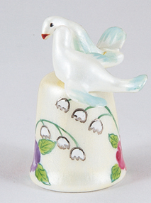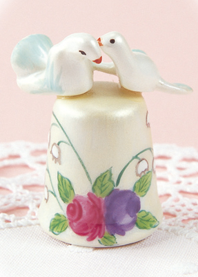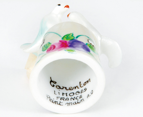銀彩の輝きが上品なすずらん、そして華やかな赤と紫のバラが咲くシンブルの上に、仲睦まじい2羽の鳥が寄り添います。一つ一つ手描きで仕上げた、独特の光沢感が美しいリモージュ焼きのシンブルです。