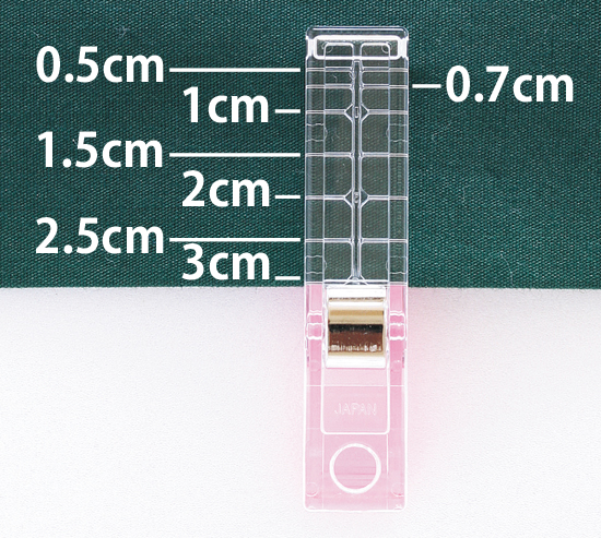 3cm 幅の縫い代まで対応するロングサイズの仮止めクリップ。縫い代幅の広いものや厚手の作品など、使える用途が広がりました。広い縫い代幅や厚手の布もしっかりホールド。