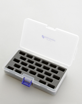 コンパクトなケースに26個のボビンが収納できます。スポンジ状の中敷がしっかりボビンを固定し、糸の絡みから守ります。