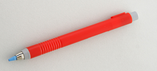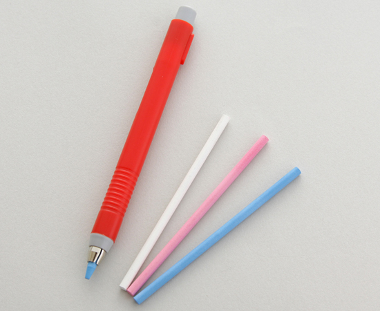 持ちやすく、使いやすいノック式のチャコペンです。芯の長さを調節でき、生地に応じて芯の色が替えられ、とても便利です。