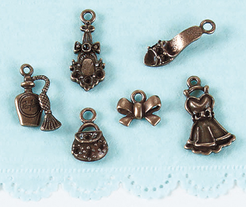 ドレスやバッグ、パフュームボトルなど、おしゃれなアイテムをモチーフにしたチャーム6種をセットにしました。アンティークゴールドの色合いも魅力。各2個ずつ入っています。