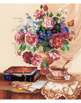 【キット作り方つき】 多彩な糸使いで奥行のある作品に仕上げる、RIOLIS社らしい新作キット。華やかなバラとさりげなく置かれた小物が、優雅なひと時を思わせるアンティークな雰囲気の作品です。中級の方へ。