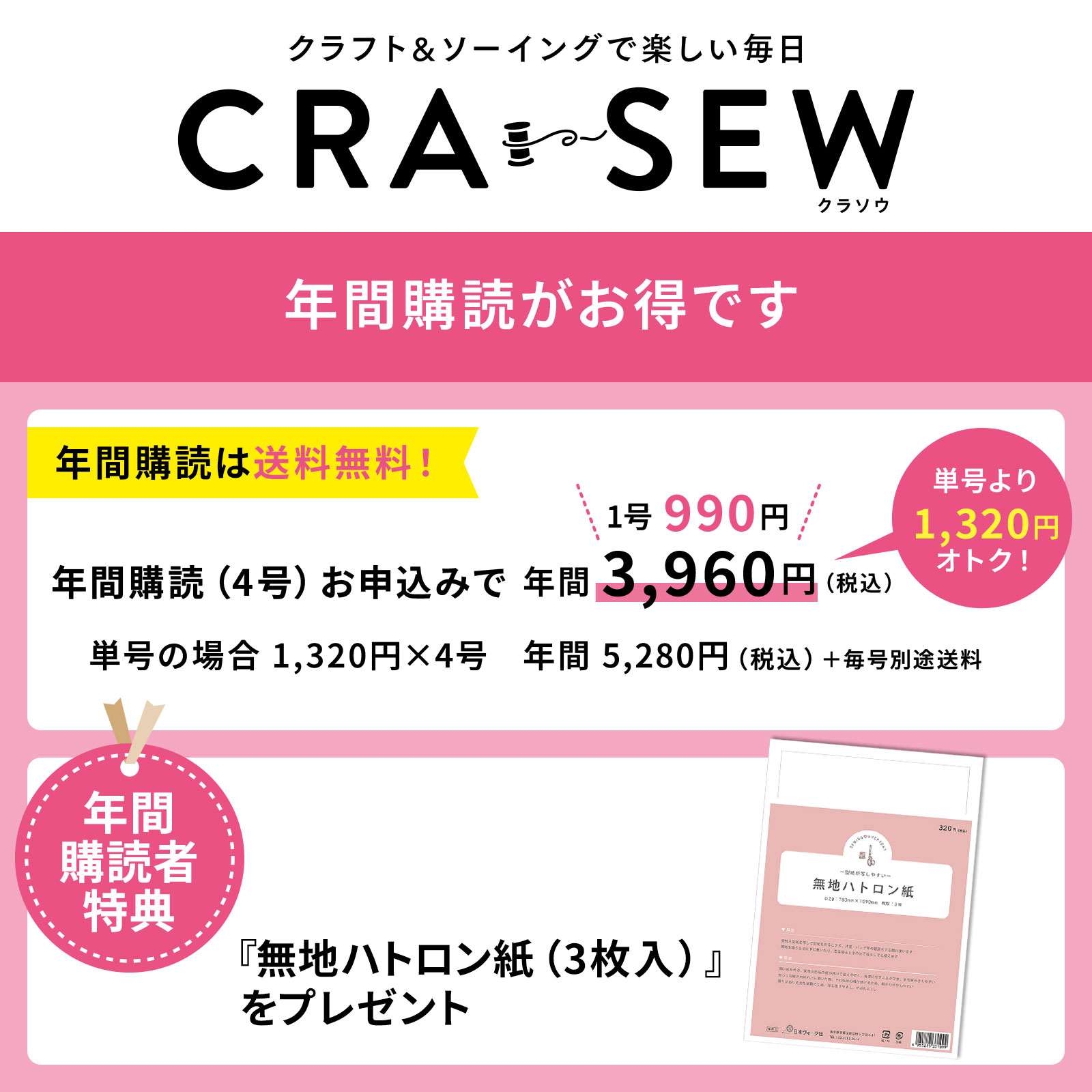 年4回(3,6,9,12月)発行の定期刊行誌。「CRA-SEW(クラソウ)」はクラフトとソーイングの造語。