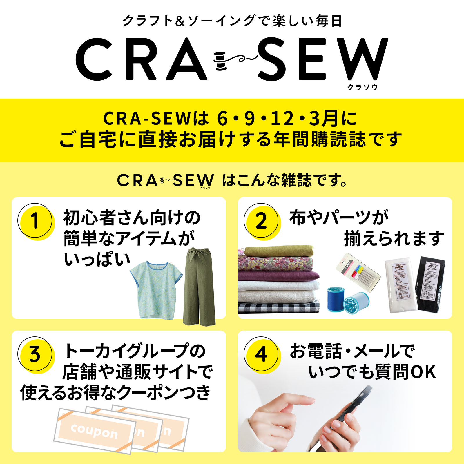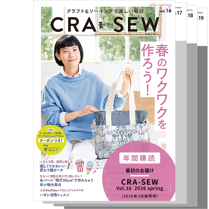 年4回(3,6,9,12月)発行の定期刊行誌。「CRA-SEW(クラソウ)」はクラフトとソーイングの造語。