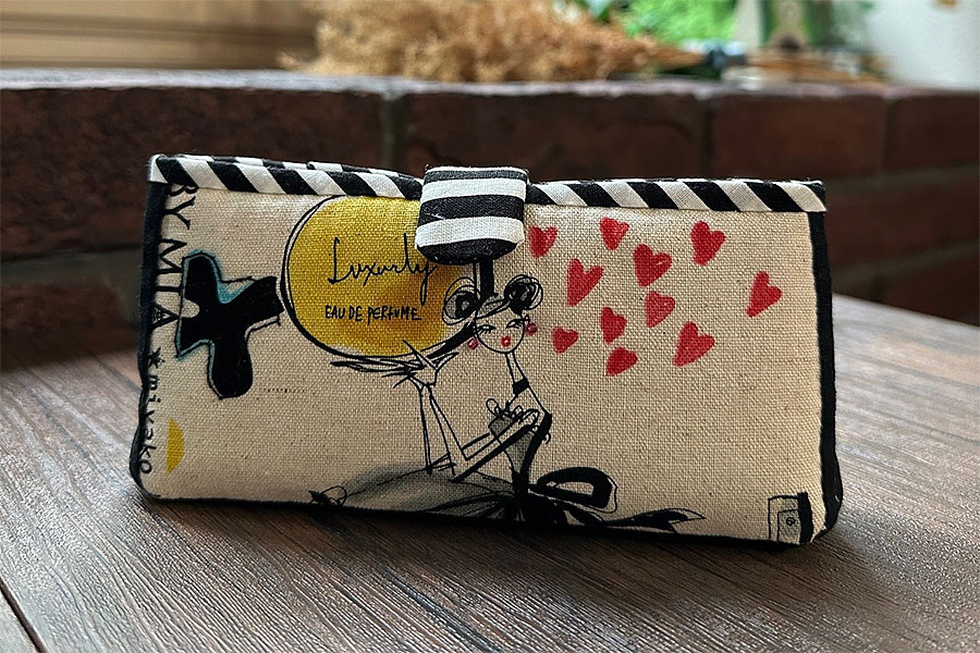 キュートな柄の生地を使っておしゃれなメガネケースを作ります。キットの生地は大きめなので、切り取る場所によって雰囲気が変わります。