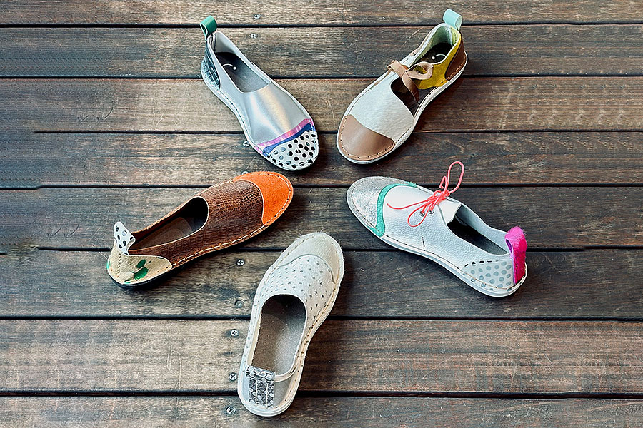 「プレーン」「ダービー」「マカロン」の3種からお好みの形をお選びいただき、1日で靴を完成させるワークショップです。いろいろな色とテクスチュアの材料から自由に選んでカスタマイズ。組み合わせは無限! とっても軽くてはき心地もGood!! 手ぶらでご参加いただけます。