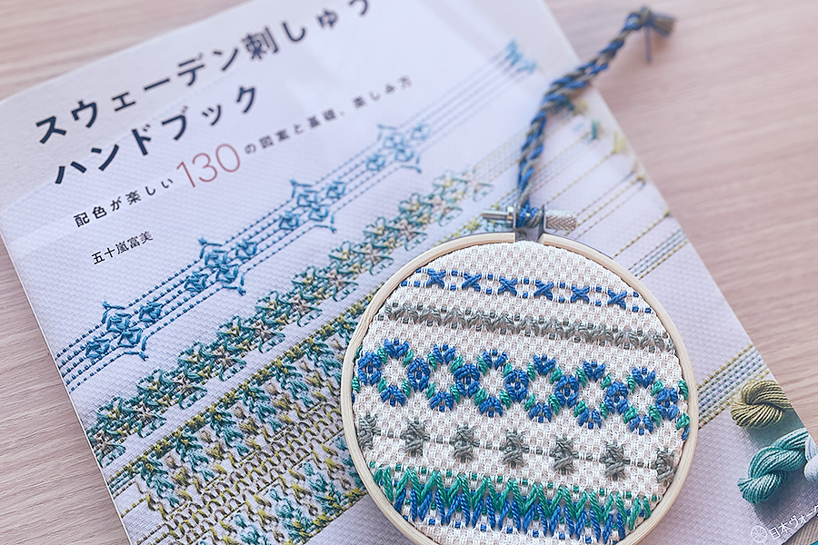 布目をすくって模様をつくっていくスウェーデン刺しゅう。刺しゅう枠に入れて飾れるオーナメントを作ります。初心者の人にもおすすめです。予約受付中。