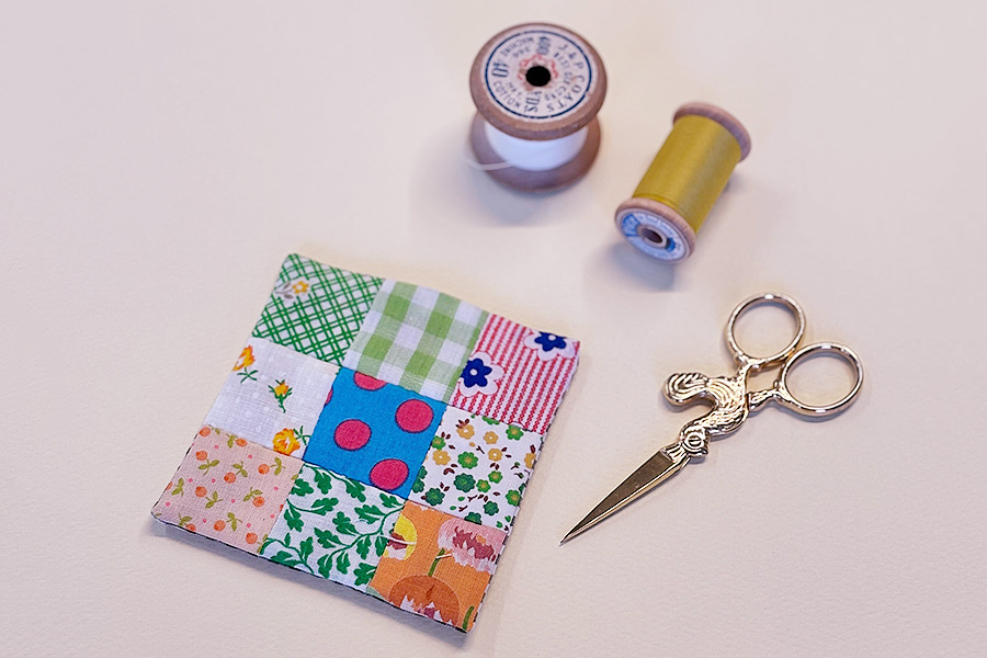 様々な生地の中から自分の好みの生地を選んで9枚はぎ(ナインパッチ)のコースターが作れるワークショップです。