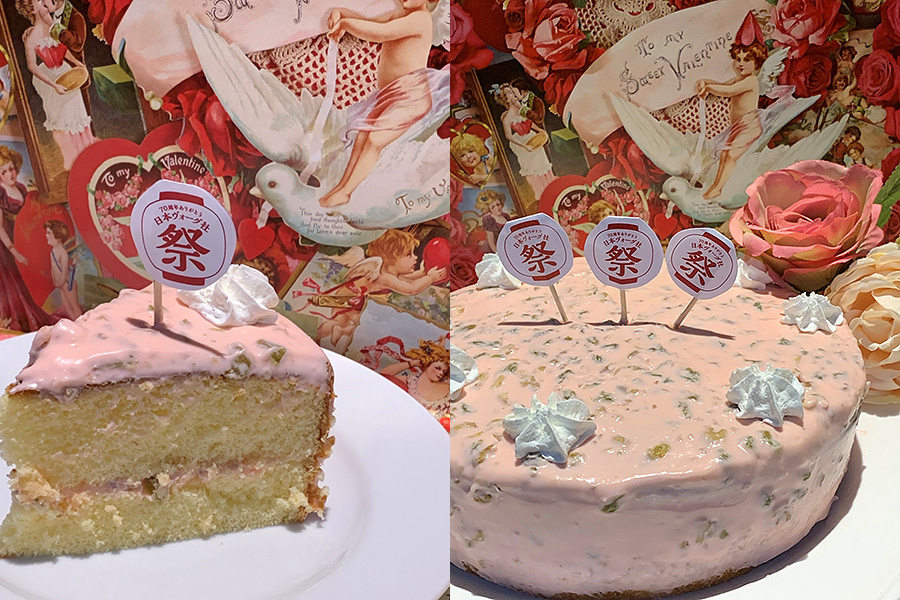 ケーキはピンク(バラ)イエロー(レモン)グリーン(ピスタチオ)の3種のクリームチーズケーキです。ドリンク付き¥800にて販売。