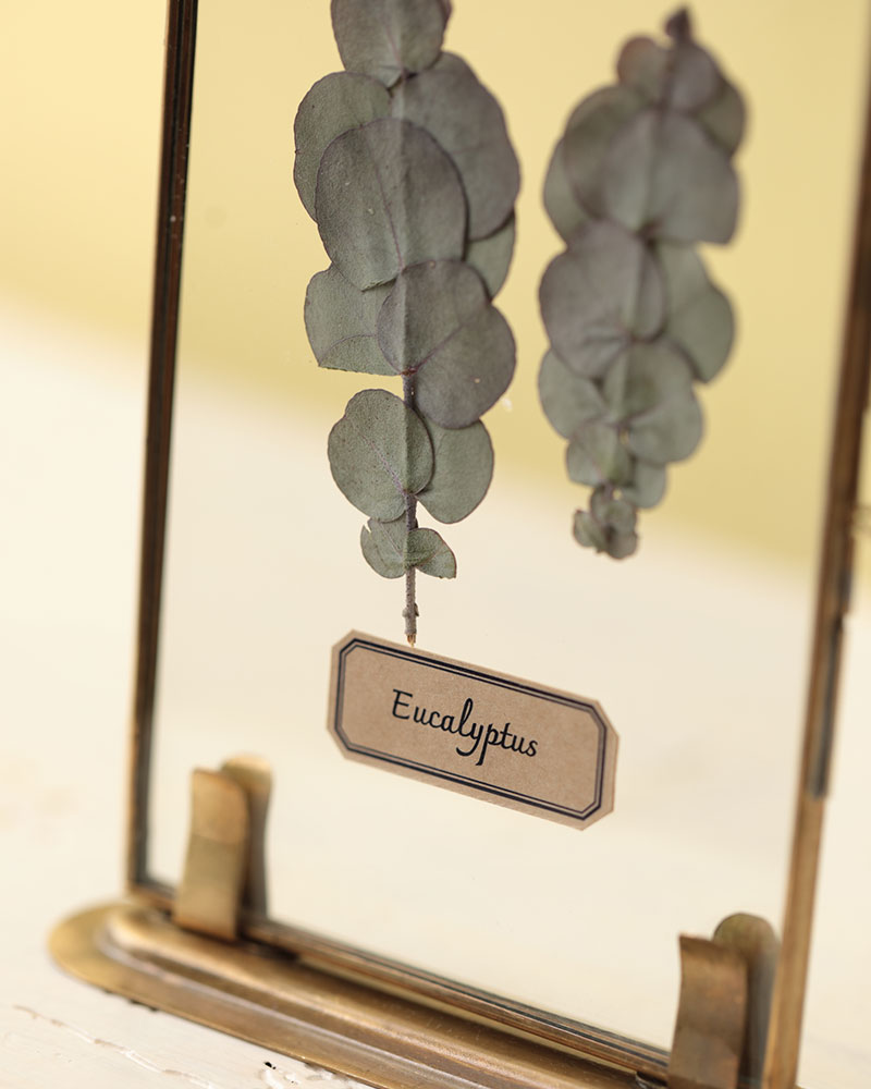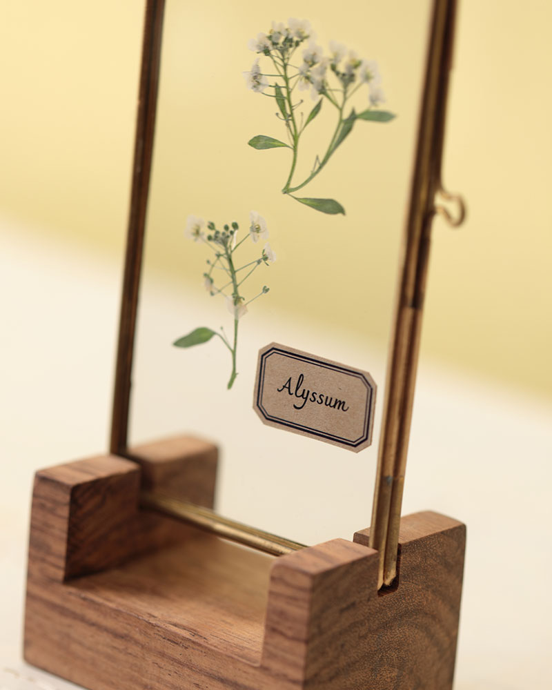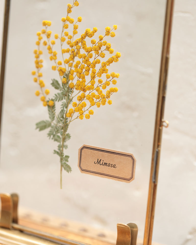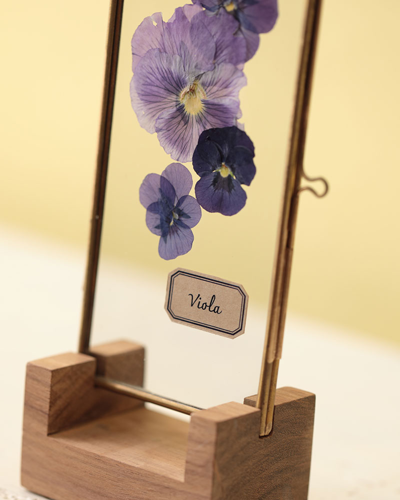 小さなガラスフレームに本物の植物(押し花)を入れたディスプレイ。