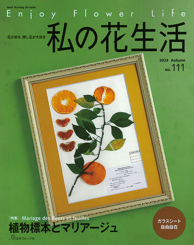 お互いを引き立て合う、相性が良い、という意味で使われる「マリアージュ」。111号はさまざまな押し花のマリアージュが集まりました。セピア色になった押し花、ガラスフレームに入れた食虫植物、さらにはユニークなフルーツ標本まで。押し花作品の参考にしたい個性的な植物標本が並びます。