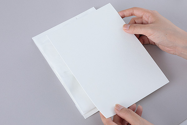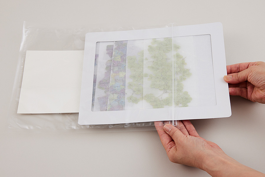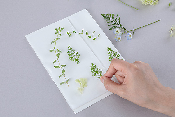 ティッシュペーパーに押し花をはさみ、ホルダーに入れてチャック付き保管袋に入れます。この時、乾燥させた状態のドライシートを入れます。
