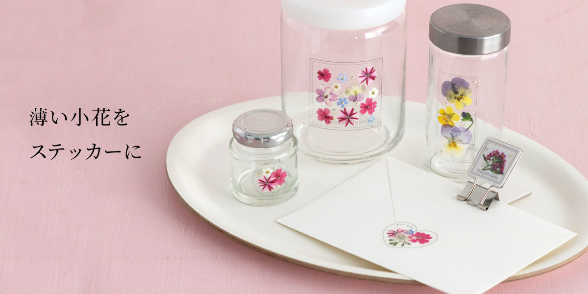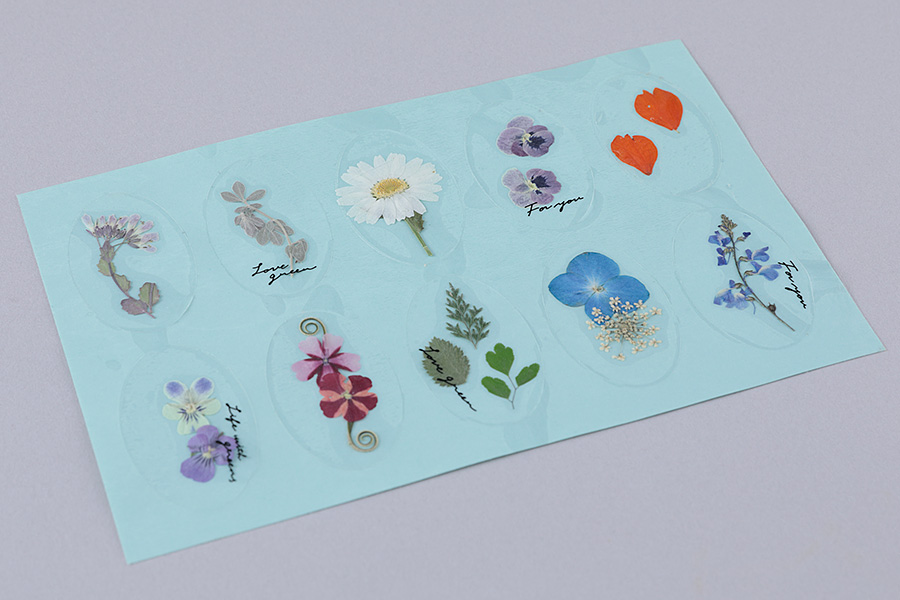 シールとセパレーターの間に押し花をはさめばできあがり。