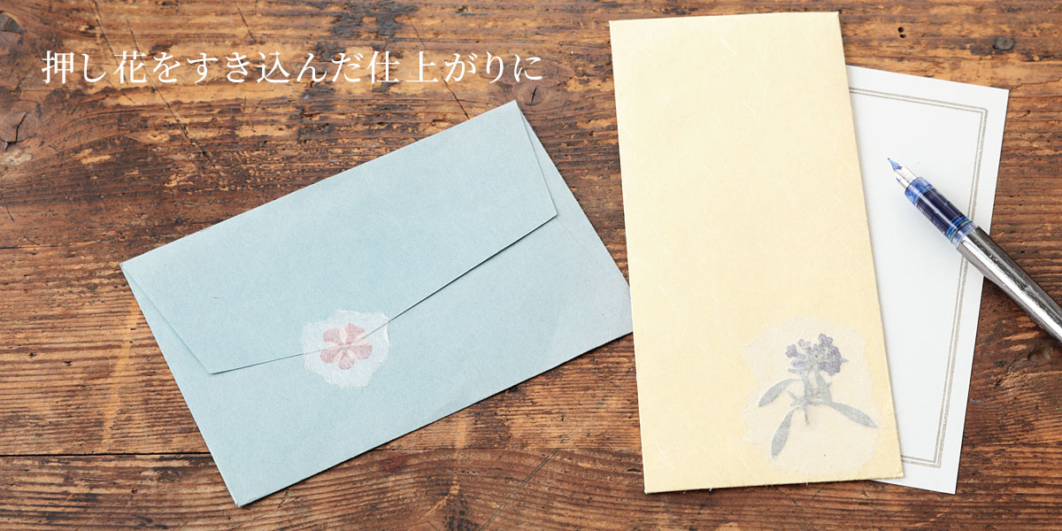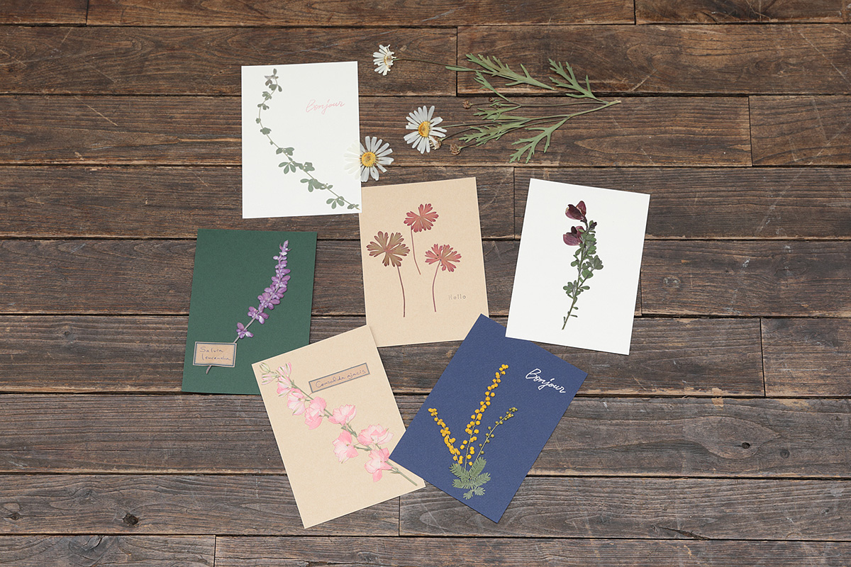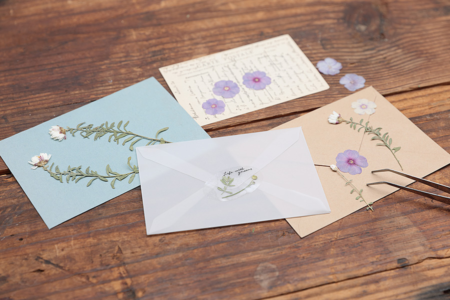 封筒やカードの上に直接押し花を置いて上からシールを貼ってもよいでしょう。