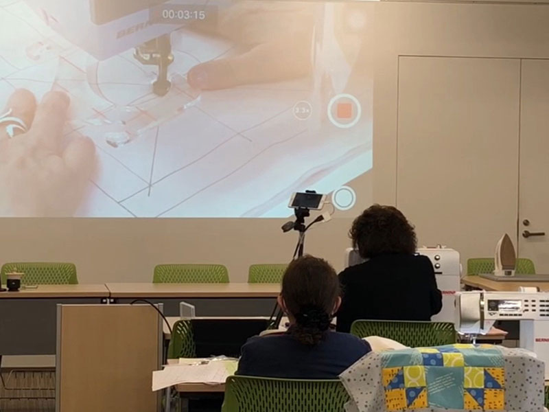 笹倉先生のルーラーワークテクニックをプロジェクターで大きく映しながらレッスンを行います。遠くの席からも見えるように工夫して、先生の周りに集まる密を避けています。
